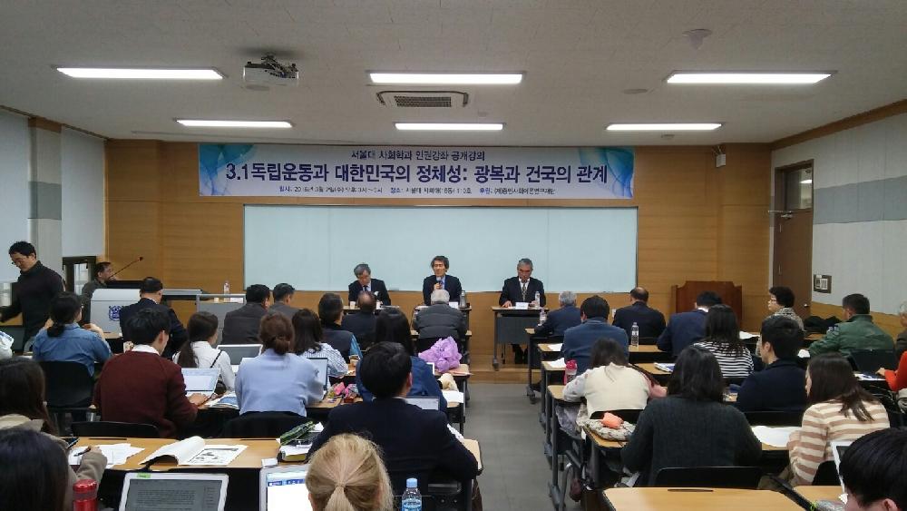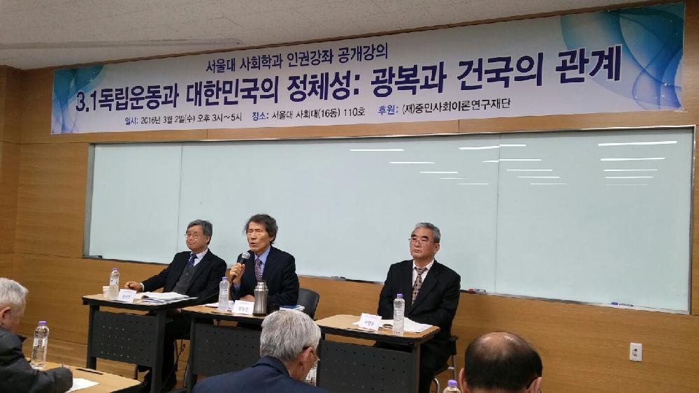 On March 2, to mark the 97th Anniversary of March 1st Independent Movement¡±, Prof. Han Sang-Jin (president of Joongmin Foundation) delivered a public lecture under the title of ¡°March 1st Independent Movement and the Identity of ROK: State Building and Ethos Realization¡±(ÎÃÜÖ), which was also the introduction to his lecture course of ¡°Human Rights, NGOs, and Global Civil Society with a Special Focus on Transitional Justice¡± opened at the department of Sociology at Seoul National University. In this public lecture, Prof. Han presented a new interpretation of the relationship between ¡°State building and Ethos Realization(ÎÃÜÖ)¡± which has been the focus of heating debates and conflicts of two interpretation camps since 2008 which are now threatening to turn into an antagonistic confrontation. According to his new interpretation mediating two opposing camps, although the establishment of government in 1948 can be understood and recognized as a state building in the context of its legal facts, the historical meaning and the normative idea((ÎÃÜÖ) of the independent movement constitute the normative foundation of state building, and this aspect of the normative legitimacy can¡¯t be reduced the legal aspect. Discussants of this lecture were Prof. Lee Young-Hoon and Prof. Han Si-Jun, who are respectively the representative of the two interpretation camps on this issue which Prof. Han tried to mediate. |