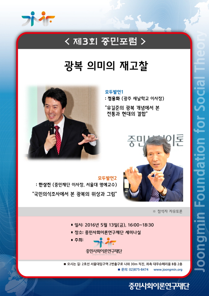 The 3rd Joongmin Forum on ¡°Reconsideration of the Meaning of 'Gwangbok'(ÎÃÜÖ: Restoration of Light)¡± was held in the seminar room of Joongmin Foundation on 13th May. 2016. In this forum, Dr. Young-Wha Cheong(Chairman of the Saenal School, Gwangju) delivered the first keynote speech on ¡°The Linkage between Tradition and Modernity in Yu Gil-Joon¡¯s Conceptions of Gwangbok¡± and Prof. Sang-Jin Han(President of Joongmin Foundation) delivered the second keynote speech on ¡°The Status and Image of Gwangbok expressed in the National Survey of Consciousness¡±.