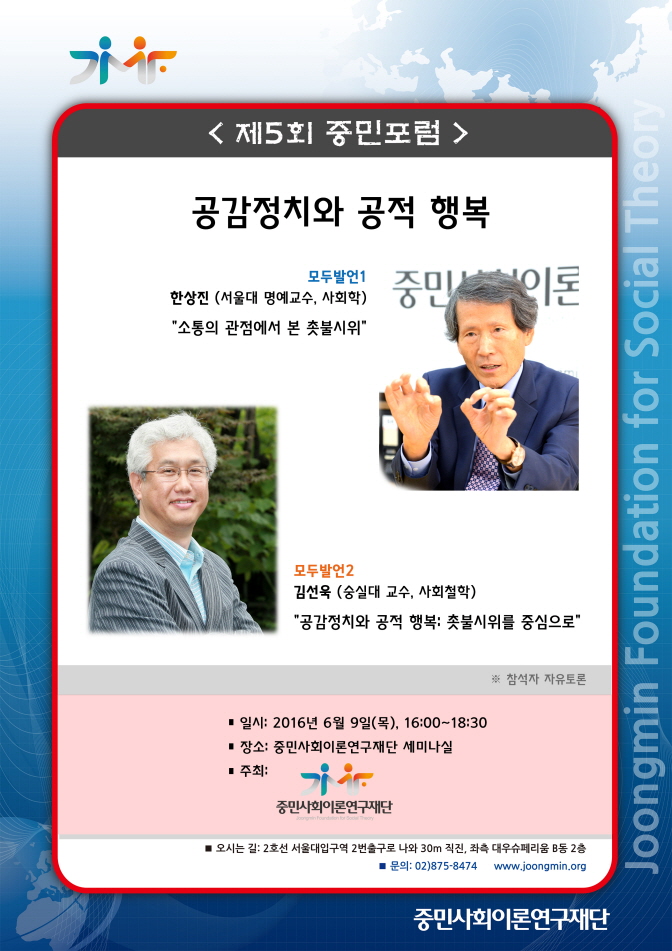 | The 5th Joongmin Forum titled ¡°Empathic Politics and the Public Happiness¡± was held June 9. 2016. Prof. Seon-Uk Kim (Social Philosophy, Sungsil University) made a first keynote speech on ¡°Empathic Politics and the Public Happiness: with a Focus on the Candlelight Protest¡±, and Prof. Sang-Jin Han delivered the second speech titled ¡°The Candlelight Protest from the Viewpoint of Communication¡±. |