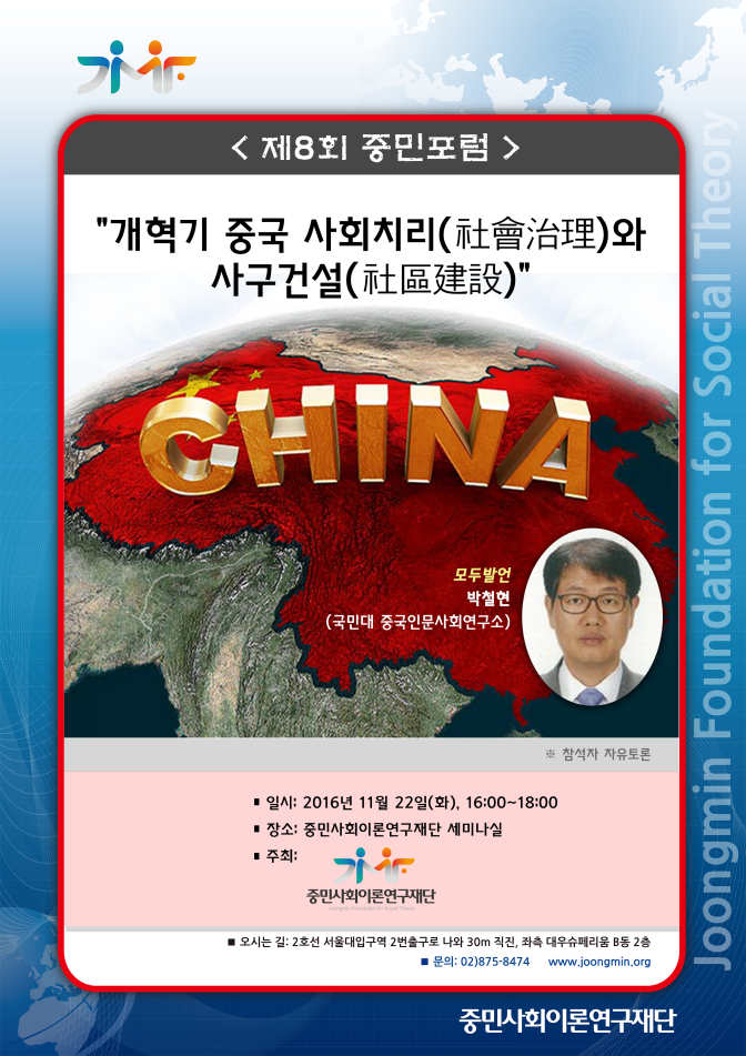 The 8thJoongmin Forum titled ¡°Social Governance and Shequ Construction in China¡± was held in Joongmin Foundation Seminar Room on November 22. 2016. In this forum, Prof. Cheol-Hyun Park (Gookmin University) delivered a keynote speech on the subject of social governance and urban community construction in China and there was an interesting discussion about it among all participants.