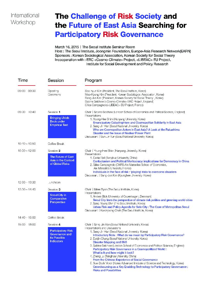 International workshop on "The Challenge of Risk Society and the Future of East Asia: Searching for Participatory Risk Governance" was co-hosted by EARN, the Joongmin Foundation for Social Theory, and The Seoul Institute (where the event was also held). Esteemed scholars from Europe and East Asia gathered to engage in academic discourse over a wide range of topics. Opening addresses were given by prominent figures such as the presidents of The Seoul Institute, the Korean Sociological Association, and the Korean Society for Social Theory. Mar.16-17, 2015.