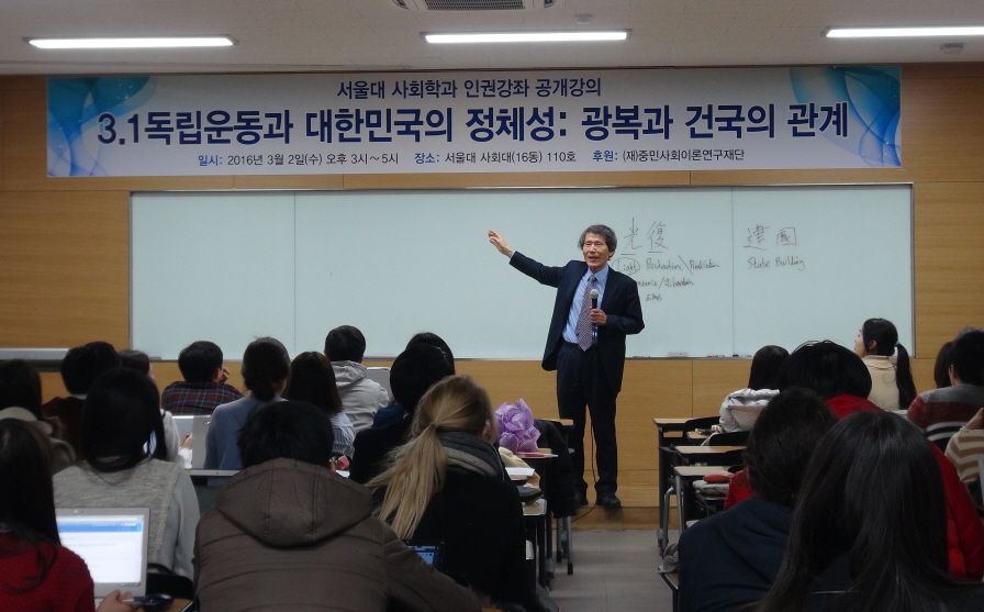 On March 2, to mark the 97th Anniversary of March 1st Independent Movement, Prof. Han Sang-Jin delivered a public lecture under the title of ¡°March 1st Independent Movement and the Identity of ROK: State Building and Ethos Realization¡±(ÎÃÜÖ), which was also the introduction to his lecture course of ¡°Human Rights, NGOs, and Global Civil Society with a Special Focus on Transitional Justice¡± opened at the department of Sociology at Seoul National University. In this public lecture, Prof. Han presented a new interpretation of the relationship between ¡°State building and Ethos Realization(ÎÃÜÖ)¡± which has been the focus of heating debates and conflicts of two interpretation camps since 2008 which are now threatening to turn into an antagonistic contestation. According to his new interpretation mediating two contesting camps, although the establishment of government in 1948 can be understood and recognized as a state building in the context of its legal facts, the historical meaning and the normative idea((ÎÃÜÖ) of the independent movement constitute the normative foundation of state building, and this aspect of the normative legitimacy can¡¯t be reduced the legal aspect. Discussants of this lecture were Prof. Lee Young-Hoon and Prof. Han Si-Jun, who are respectively the representative of the two interpretation camps on this issue which Prof. Han tried to mediate.